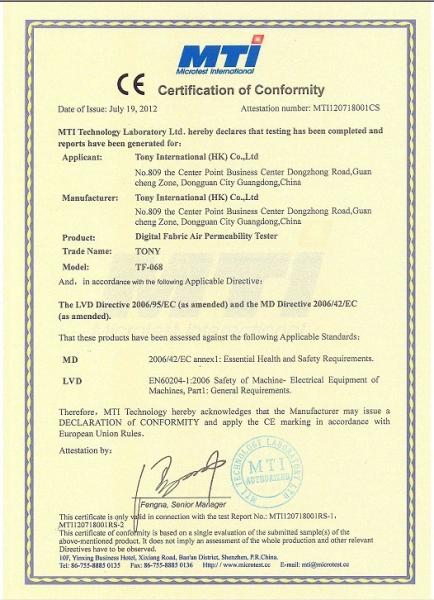 CE Certificate of CHAIR TESTER/FUNITURE TEST
